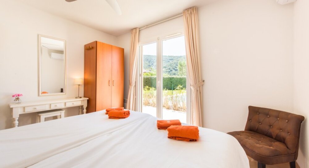 From the villa you walk through the patio doors into your garden where you can enjoy the outdoors under the spacious covered terrace with patio furniture. The private pool in the garden has a large terrace. The private pool is available from April to October.