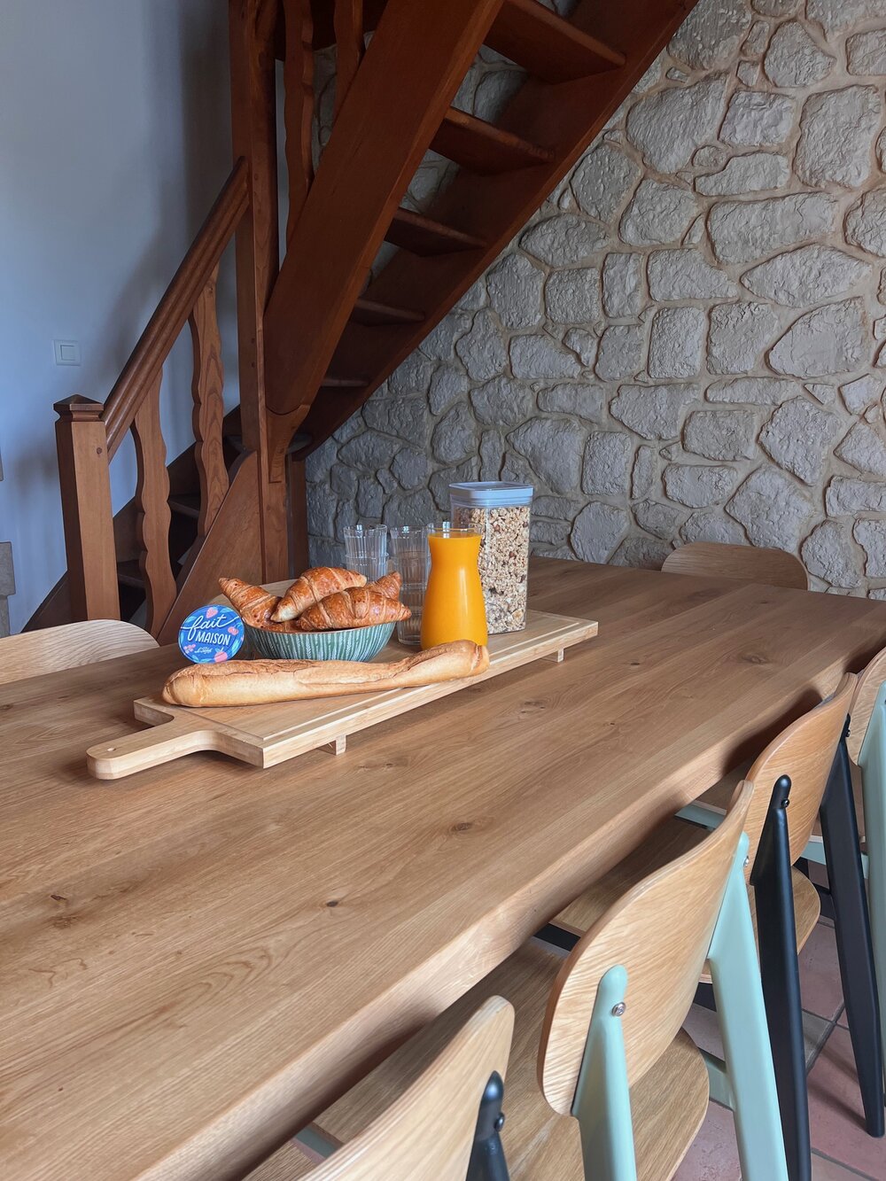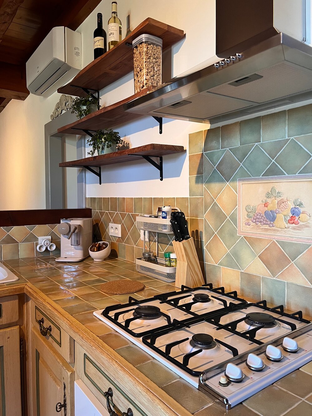 La maison dispose d’une cuisine ouverte entièrement équipée, avec tout le confort moderne : lave-vaisselle, machine Nespresso, plaque de cuisson au gaz, four, micro-ondes, grand réfrigérateur et congélateur.
