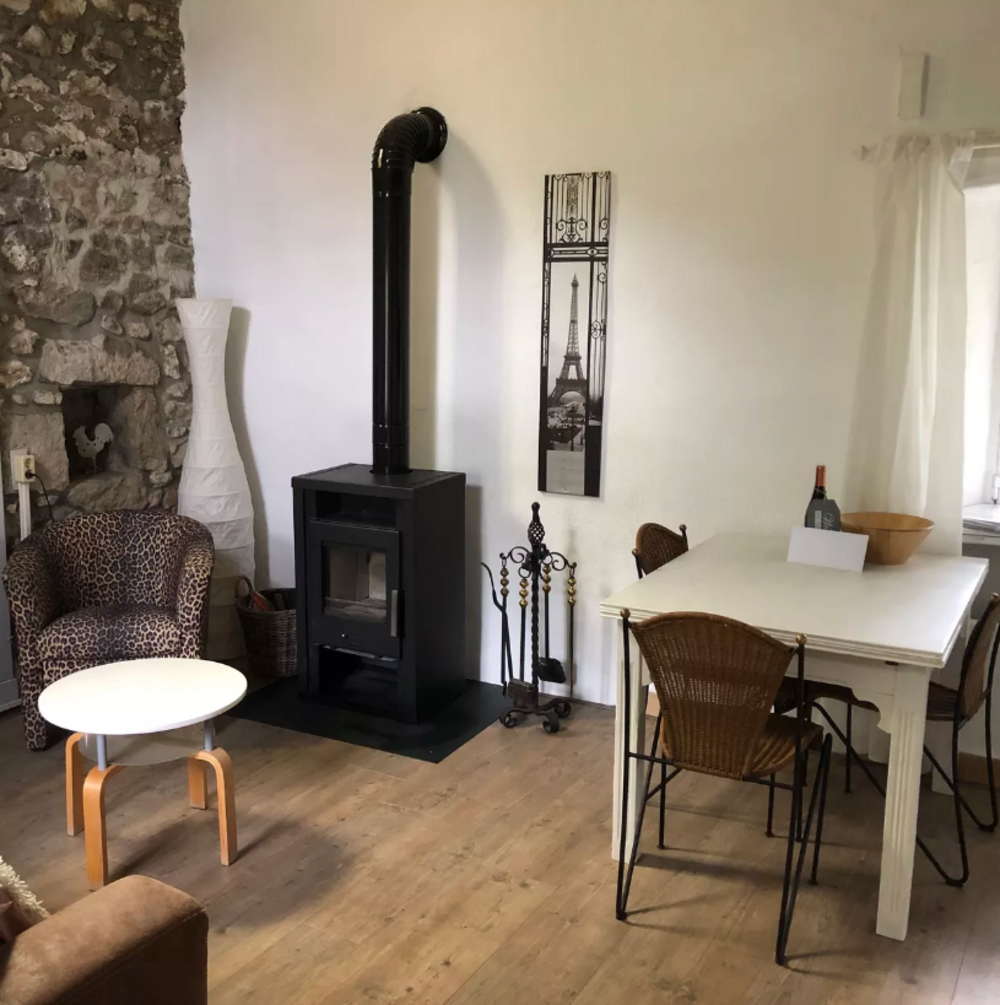 La Châtaigne est lumineuse, cosy et confortablement meublée tout en conservant des éléments authentiques. Le salon dispose d'un joli poêle à bois, d'un coin salon et d'un coin repas. A côté se trouve la cuisine entièrement équipée avec cuisinière à gaz, four, réfrigérateur avec congélateur et tous les équipements de cuisine nécessaires.