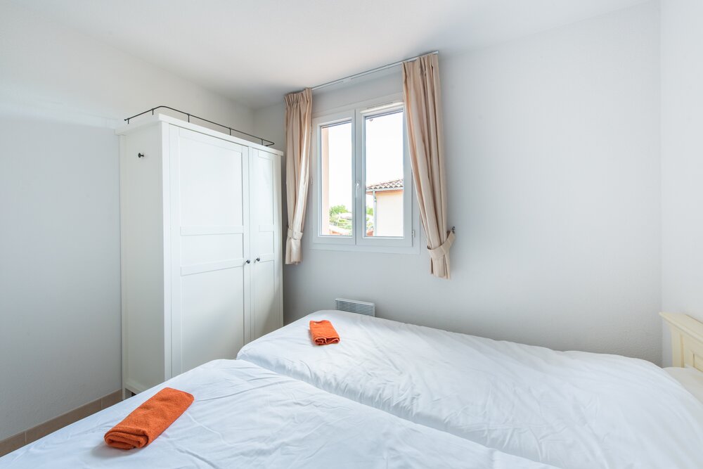 Ruime woonkamer met banken en fauteuils, televisie met onder andere Nederlandstalige kanalen. Er is een grote eethoek met stoelen, open keuken voorzien van alle moderne gemakken en een Dolce Gusto koffieapparaat. In de woonkamer is ook airconditioning beschikbaar. Via de schuifpui in de kamer loopt u zo het overdekte terras op richting het privézwembad. Daarnaast zijn er op de begane grond twee slaapkamers met airconditioning voor twee personen en een badkamer met bad en toilet.